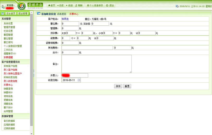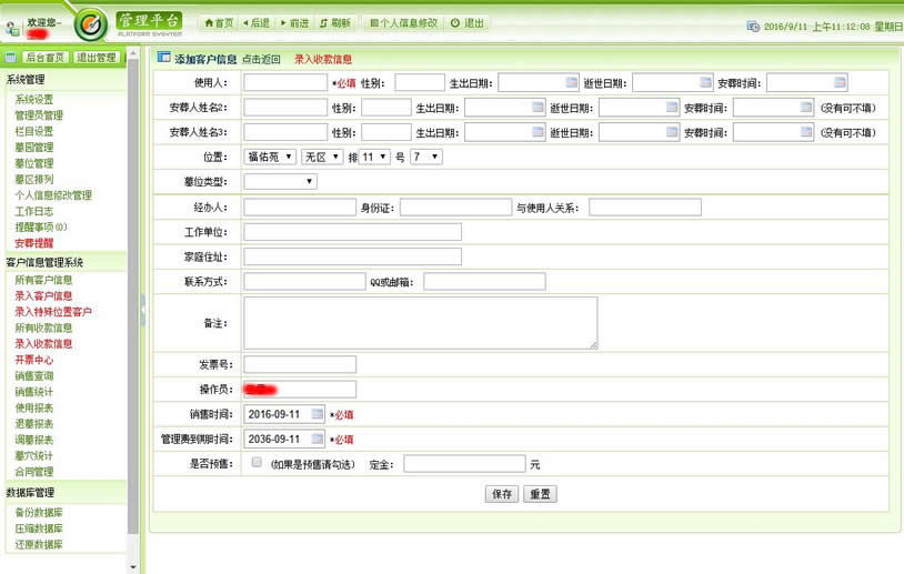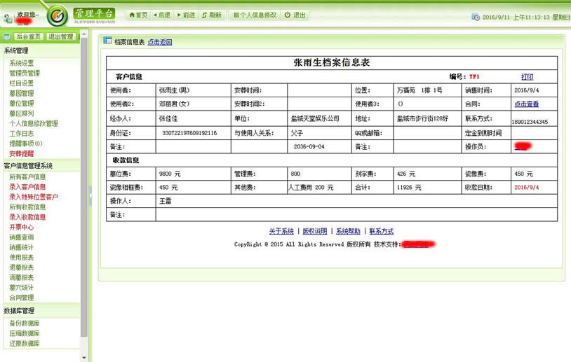 系統按照陵園的業務系統進行設計,組建陵園的企業生產管理系統;整個單位的業務流程,全部借助計算機來進行管理,結合先進的管理思想,借助現代計算機技術和方法,提升業務信息縱向橫向傳輸效率和質量,實現墓地銷售、結算管理(預售、退費)、客戶管理、安葬管理、位置管理、合同管理、墓地管理期限到期提醒、二維碼便民查詢等進行全方位業務管理,具有各種統計、分析、查詢、打印數據和報表的管理功能。提高陵園業務的辦公效率和質量,讓管理者隨時監控本單位的運行狀況,作出科學決策;可通過信息化手段規避不必要的風險(避免墓地的重復銷售、到期信息的智能化提醒、欠費提醒及控制等),規范企業管理,從而提高辦公效率,降低管理費用,提高企業形象,使企業的生產、經營信息得到及時反饋,從而有效管理、監督、控制企業經營活動,規避企業經營風險,為最終實現企業經營目標服務。